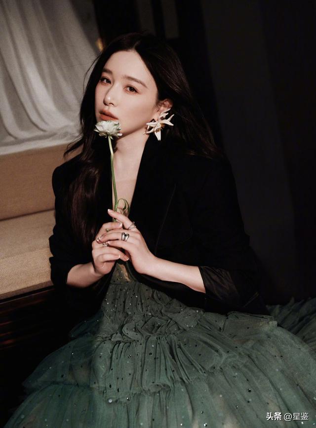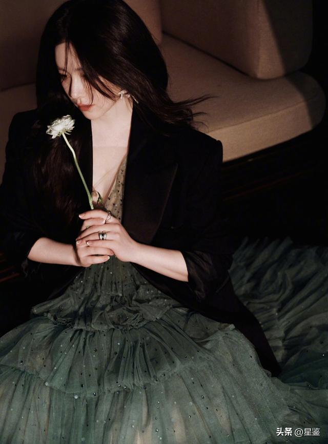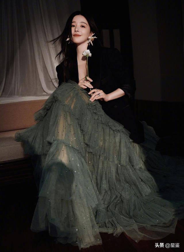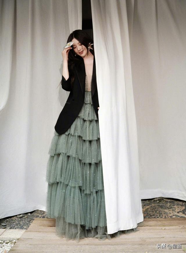 下装的灰绿色层叠纱裙是整套look的灵魂,层层薄纱像雾霭里的森林,裙身点缀的细碎银钻在光下闪着微光,既保留了纱裙的飘逸仙气,又不会显得过于甜腻,和黑西装的硬朗形成强烈视觉碰撞,走路时裙摆摇曳,氛围感直接拉满。