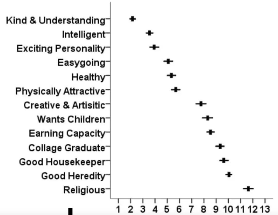 一项有33个国家9474人参与的研究发现,「智慧」是人们挑选伴侣时第二看重的特征,仅次于善良,而颜值身材其实只排在第六名。